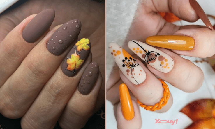 Якщо ви зробите на одній руці нігтики жовтого, помаранчевого, червоного та коричневого кольорів, а на другій — молочного, який буде декорований осіннім листям, то ваш манікюр буде одним із наймодніших. Сміливо міксуйте відтінки, малюнки, блискітки та стрази. Колірну гаму манікюру можна не підбирати під гардероб — в моді контрасти.