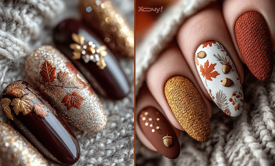 Актуальним залишається декор листям, осінніми ягодами, гілками дерев і тематичними надписами. У моді також золота патель, фольга, декор на багатошаровому френчі. Сміливо поєднуйте жовтий із чорним або червоним, помаранчевий — із золотим або молочним.