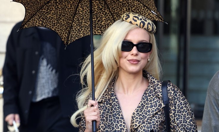 Міллі спокусилася на трендовий анімалістичний принт, а тому приміряла леопардовий total look. Так, на акторці була сукня-тренч, яку вона поєднала з капелюшком-таблеткою, чорними капроновими колготками та туфлями на підборах. Завершили образ сумка, яку зірка носила на плечі, окуляри від сонця та парасолька.