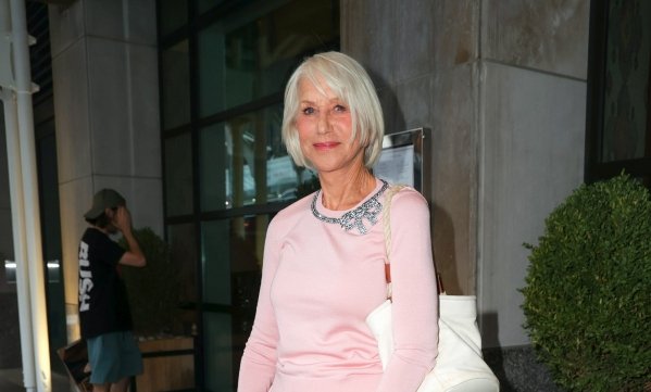 Цього дня на Гелен був красивий ансамбль в ніжному рожевому кольорі, який складався з довгої спідниці та джемпера. Горловину останнього прикрашав декор у вигляді блискучого банта. На ногах у неї були замшеві туфлі кольору запорошеної троянди, а на плечі - біла сумка з ручкою-мотузкою. Міррен розпустила волосся та зробила красивий макіяж.