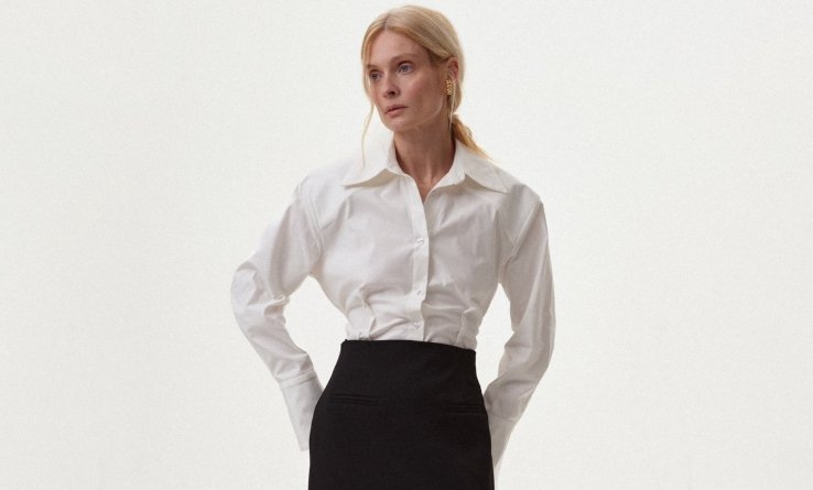 З чим поєднувати: використовуйте лінію низу як головний візуальний акцент. Додайте чорний лонгслів для монохромного ефекту або зробіть образ гострішим за допомогою шкіряної куртки.