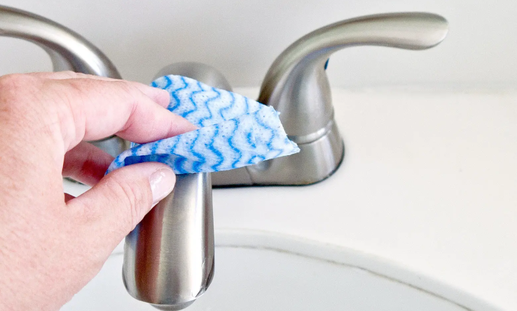 У мисці невеликого об’єму потрібно змішати 10 г солі, 1 ч.л мийного засобу для посуду і видавити трішки зубної пасти. Добре розмішайте та за допомогою губки нанесіть на поверхні, які забруднилися.Такий спосіб підходить для кранів, раковини та кахельних поверхонь. У надто забруднених місцях потрібно злегка потерти, щоб ефективно відчистилося.