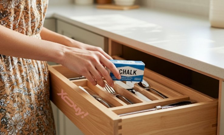 Крейда володіє чудовою властивістю - вона надзвичайно ефективно поглинає зайву вологу. А так, як багато людей звикли класти ложки та виделки не витираючи їх від води, то у шухляді тримається вогкість, яка і призводить до корозії металу. Тому кілька шматочків крейди здатні попередити іржу та корозію.