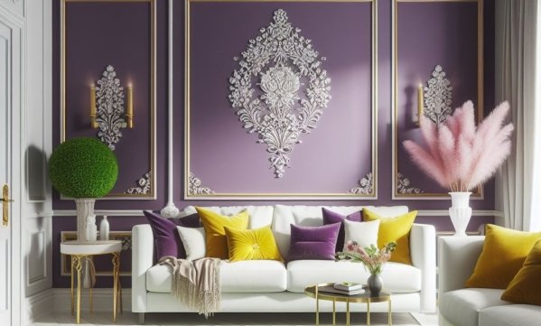 Якщо ваша зала простора, можна брати насичені фіолетові відтінки. Для маленьких кімнат підійдуть світлі пастельні тони. Бузкові з молочним стіни візуально додадуть простору.