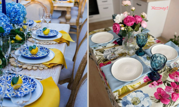 У тренді — поєднання пастельних контрастних або просто яскравих кольорів. Наприклад, посуд може бути жовтим, фіолетовим або червоним. Тоді скатертина — універсальна біла чи молочна, серветки — колірні або в квіти, і у вазі на столі — такий же букет, аби створити ефект набору.