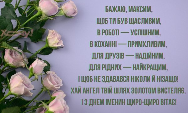 Максиме, вітаю тебе з Днем ангела! Нехай не тільки твій вірний янгол-охоронець тебе оберігає від незгод, а й доля не посилає перешкод. Нехай все у тебе вдається без зайвих зусиль, нехай оточують тільки привітні люди, а мрії стають реальністю!