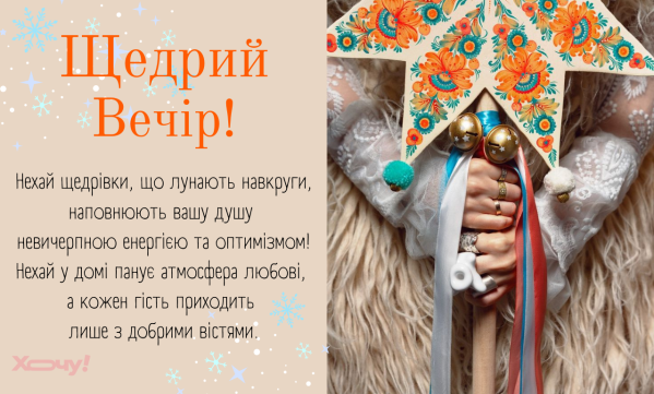 Бажаю, щоб Щедрий Вечір обдарував вас не лише смачними наїдками, а й щирими усмішками найдорожчих людей. Нехай старий рік забере із собою всі тривоги, залишаючи місце для нових мрій та неймовірних звершень. Нехай ваша оселя буде сповнена дитячого сміху, затишку та добробуту, який ніколи не закінчується. Хай доля буде прихильною до вас, даруючи лише приємні сюрпризи та вірних друзів.
