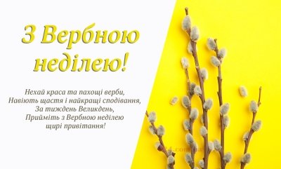Вітаю з Вербною неділею! У цей особливий день, що прийшов до нас з біблійних часів, хочу побажати тобі добробуту, любові та щастя. Добро, радість та благоденство нехай будуть завжди поруч з тобою. Нехай сам Господь береже тебе та охороняє на життєвому шляху.