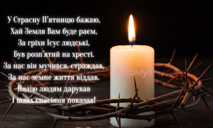 Вітаю зі святом! У Страсну п'ятницю бажаю чесноти, праведності, духовного очищення та каяття. Хай благими будуть дії та помисли, пробачте недругам, хай світом і любов'ю наповняться серця. Добра вам, прощення, любові!
