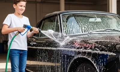 Насамперед встановіть машину на рівній поверхні де вода не заважатиме. Далі потрібно від’єднати шланг від входу води і налити всередину 20-30 мл гелю для посуду. Далі приєднати шланг назад. Тоді вода, яка проходитиме через шланг з гелем на виході буде видавати багато піни, як на автомийці. За 2-3 хвилини машина буде покрита піною і почне литися чиста вода, якою залишиться лише змити піну. Після висихання відполіруйте метал і у дорогу!