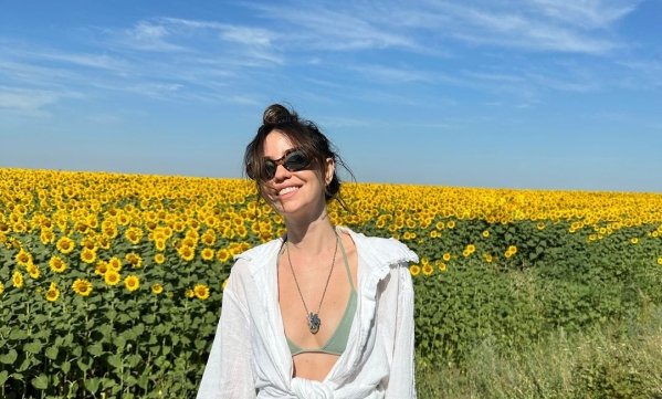 Вбрана Дорофєєва при цьому у білі штани та трикутне бікіні в оливковому кольорі. Своє волосся вона залишила розпущеним спадати на плечі.