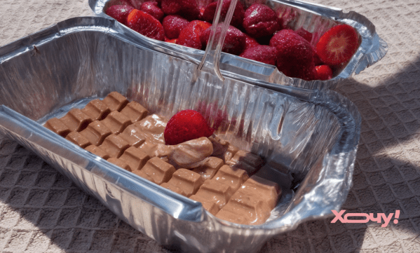 Оберіть сонячну галявинку в парку чи іншій зеленій зоні та розстеліть там свій плед. Далі все максимально просто - перекладіть шоколадку з упаковки у фольгований контейнер і залиште його на сонці на деякий час. Коли шоколад розтане, ви зможете вмочати у нього ягідки полуниці та ласувати.