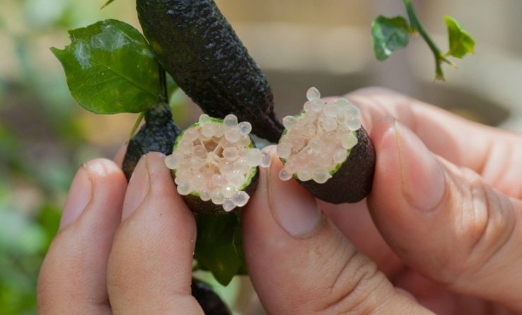 М’якоть цього лайма складається з сотень маленьких пружних кульок, і тим самим нагадує ікру. Коли ви розкушуєте ці “ікринки”, вони буквально “вибухають” у роті чистим та концентрованим лаймовим смаком.