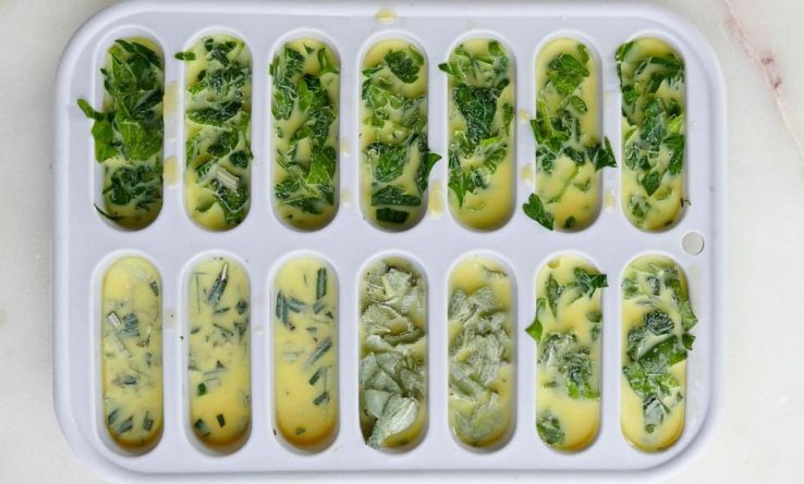 Окрім зелені, знадобиться ще нерафінована оливкова олія або масло гхі. Якщо не плануєте сильно нагрівати кубики під час приготування, можна замінити олію розтопленим вершковим маслом. Також знадобляться силіконові формочки для льоду або кексів.