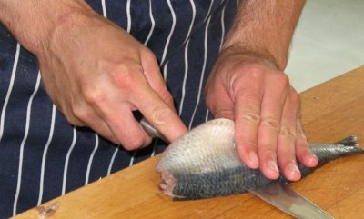 Перш за все, у рибини відрізаємо голову і розрізаємо черевце. Виймаємо нутрощі, стараючись не пошкодити жовчний міхур. Чорну плівку теж виймаємо.