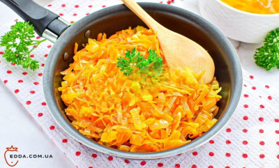 Все просто - додайте до моркви та цибулі на сковороді щіпку цукру. Не бійтеся, це не зробить страву солодкою. Цукор карамелізується і надасть овочам красивий золотистий колір.