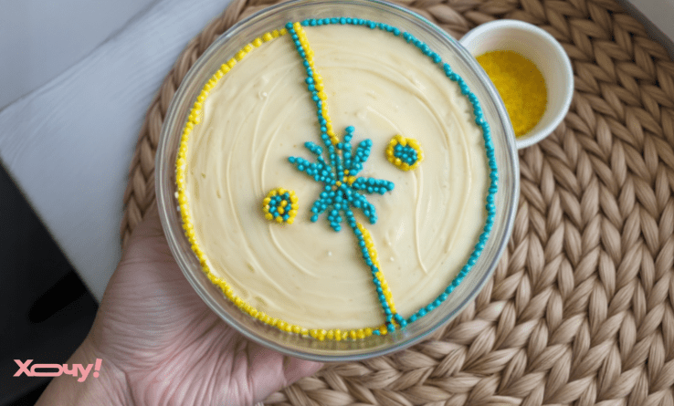 М’яке масло викладіть у мисочку і розрівняйте лопаткою. Вам знадобиться пінцет і кондитерська посипка у патріотичних кольорах.