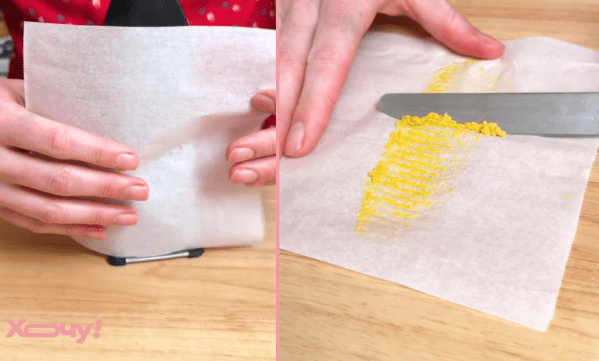 Потім просто зніміть резинки, покладіть пергамент разом із цедрою на стіл. Обережно зберіть всю цедру ножем до останнього грама.