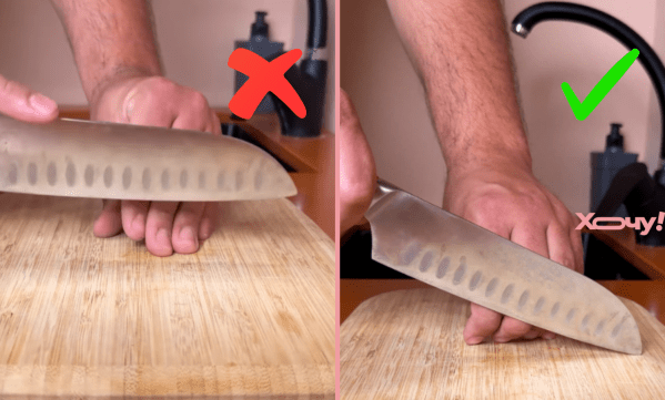 В цей момент лезо загрожує тій руці, яка тримає продукт. Тому кухарі, притискаючи інгредієнт під час нарізання, загинають кінчики пальців всередину долоні. Не знаючи про цей трюк, легко зачепити ножем палець чи ніготь.