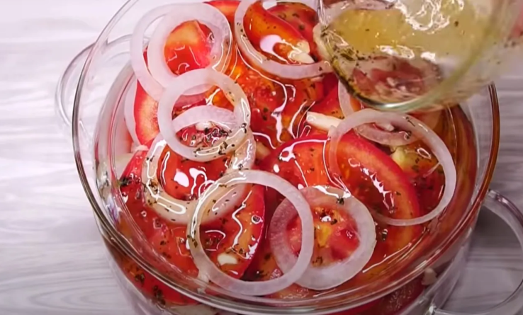 У контейнер шарами викладіть нарізані помідори та цибулю, чергуючи їх. Кожен шар рясно полийте маринадом, щоб овочі рівномірно просочилися.