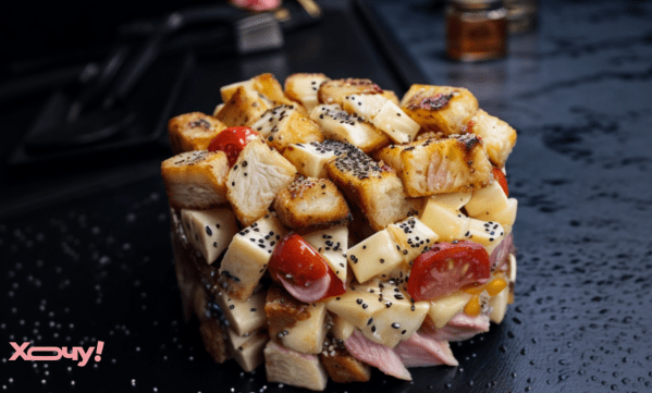 Цей салат готується з курки, сиру, яєць та сухариків, з додаванням насіння маку. Рецептом поділилась кулінарна блогерка під ніком vita_vorotniuk.