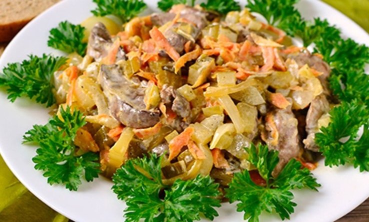 Рецептом у своєму блозі поділилась переможниця одного з сезонів “МастерШеф” Ольга Рябенко. Поєднання печінки, смажених овочів та солоних огірків дуже просте, але при цьому дуже вдале.