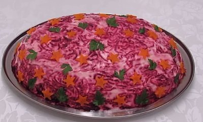 Салат можна прикрасити, якщо є таке бажання. Наприклад, покласти зверху зелені або вирізати красиву фігурку з відварених овочів, що лишилися. А можна просто останній шар майонезу зробити у формі якогось візерунка — соусу між шарами повинно вистачити, щоб “Пісна Шуба” гарно просочилася.