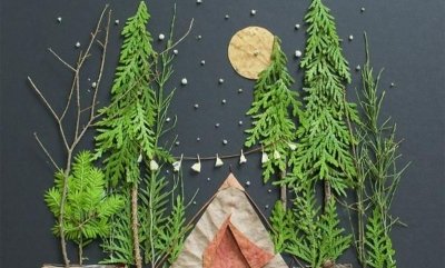 Створіть нічну зимову композицію на темному картоні. Посередині — будинок із гілок або кольорового паперу. Туя буде виглядати, як ялинки. Інші гілки можна приклеїти, аби вони асоціювалися із зимовими деревами без листя.