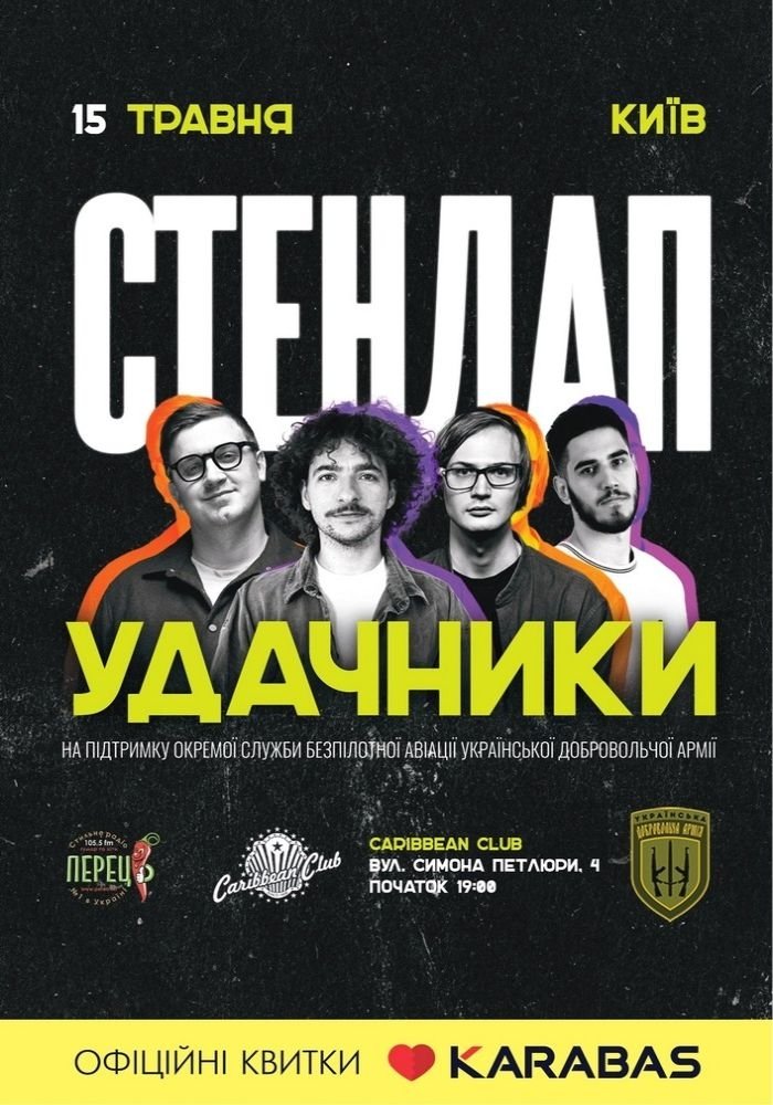 Запрошуємо вас на благодійний стендап-вечір "УДАЧНИКИ" у Caribbean Club! Це буде вечір сміху заради важливої мети — допомоги аеророзвідці Української Добровольчої Армії, що щодня завдає ударів по ворогу. На сцені виступатимуть Василь Байдак, Женя Коротков, Олександр Качура та Юра Коломієць.