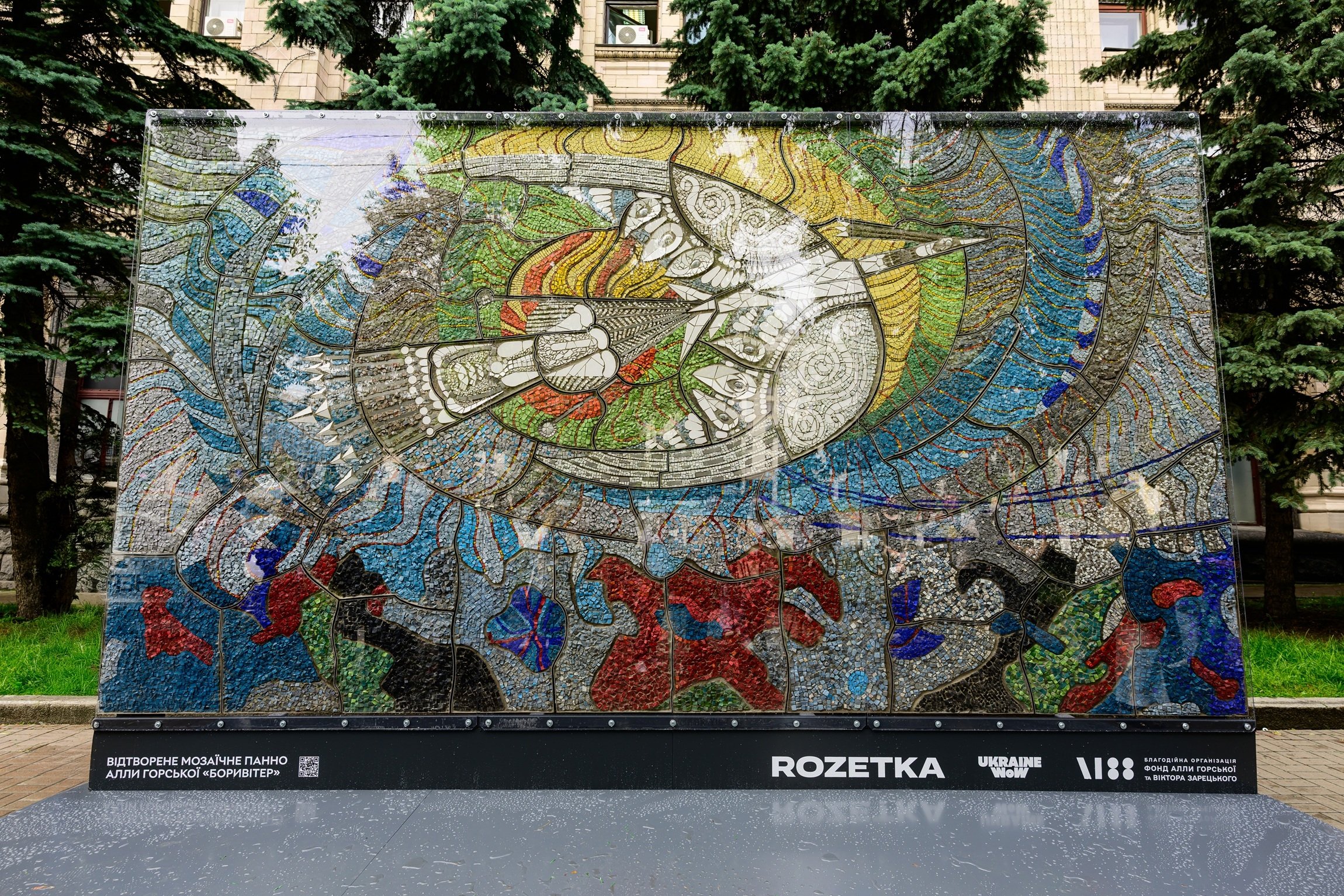 До слова, спеціально для «Боривітра» також створили спеціальну конструкцію, яка дозволяє йому безпечно мандрувати. Відтворена мозаїка була представлена в Києві у червні 2025 року.