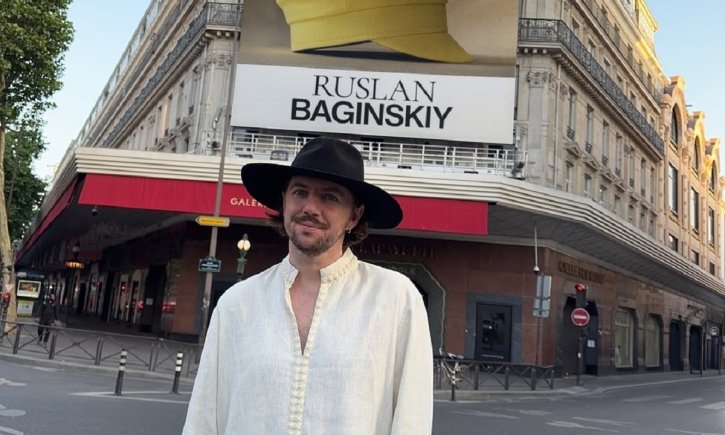 На одному з фото, які опублікував Багінський на сторінці бренду в Instagram, він зазнімкований на тлі фасаду універмагу. Останній був прикрашений банером Ruslan Baginskiy у кольорах українського прапора.
