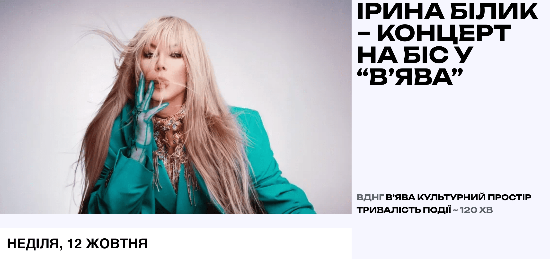 Після перерваного через тривогу літнього концерту Ірина Білик повертається на сцену "В’ЯВА", щоб завершити сезон 2025 року. Цього вечора звучатимуть найулюбленіші пісні співачки та, можливо, кілька сюрпризів.