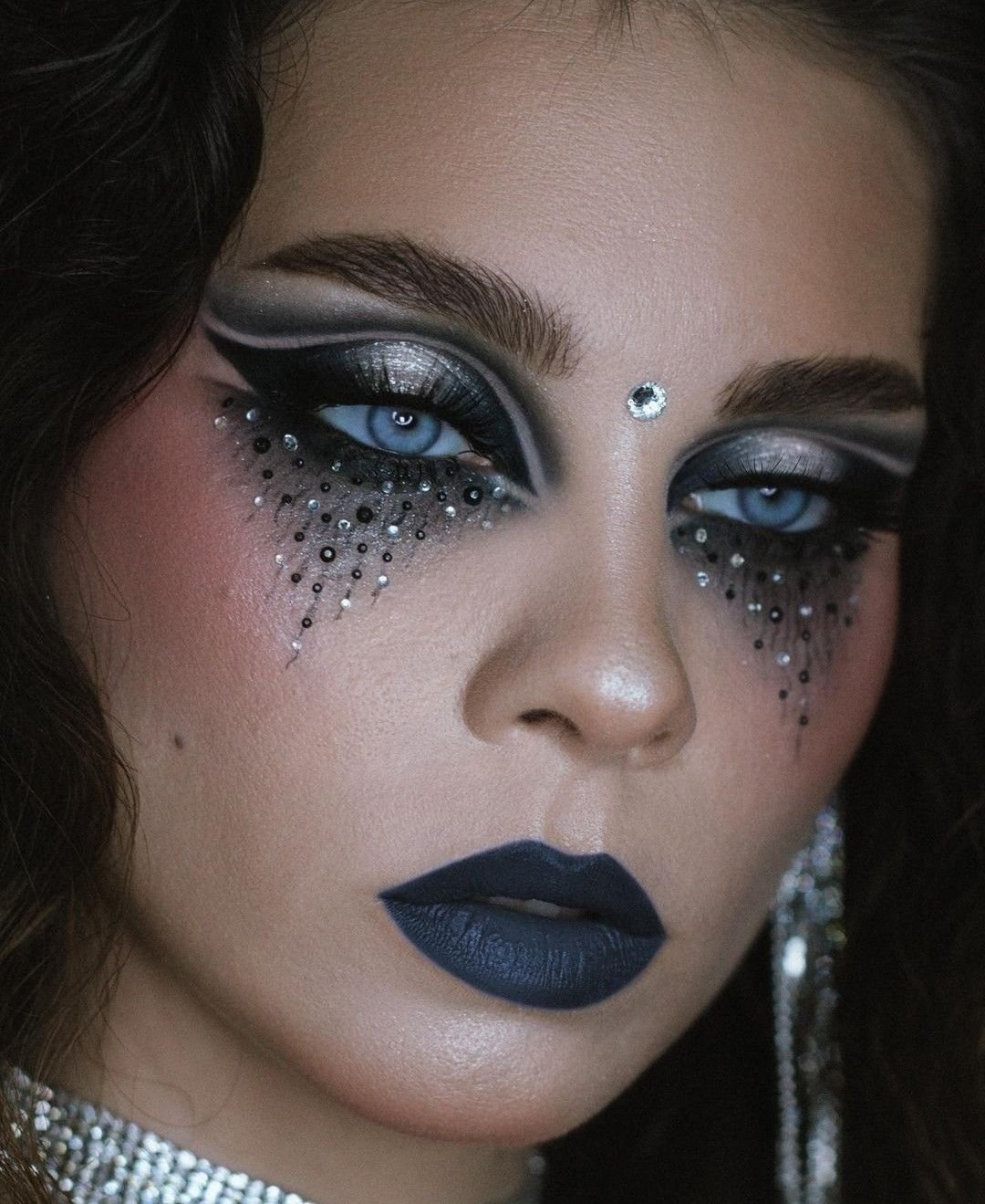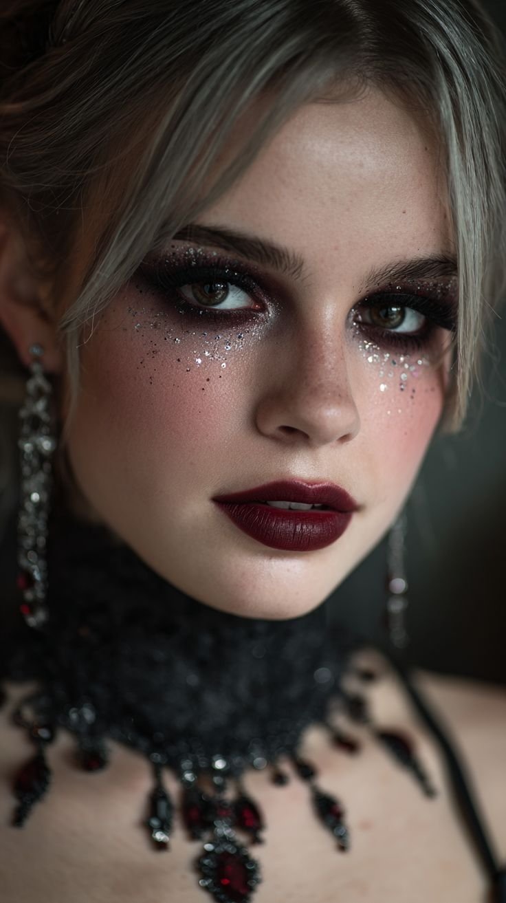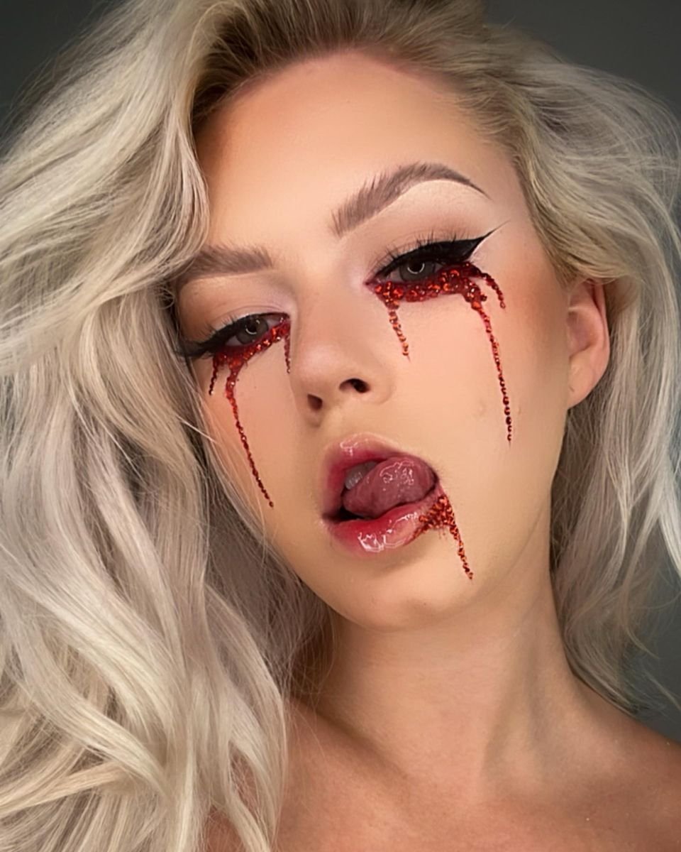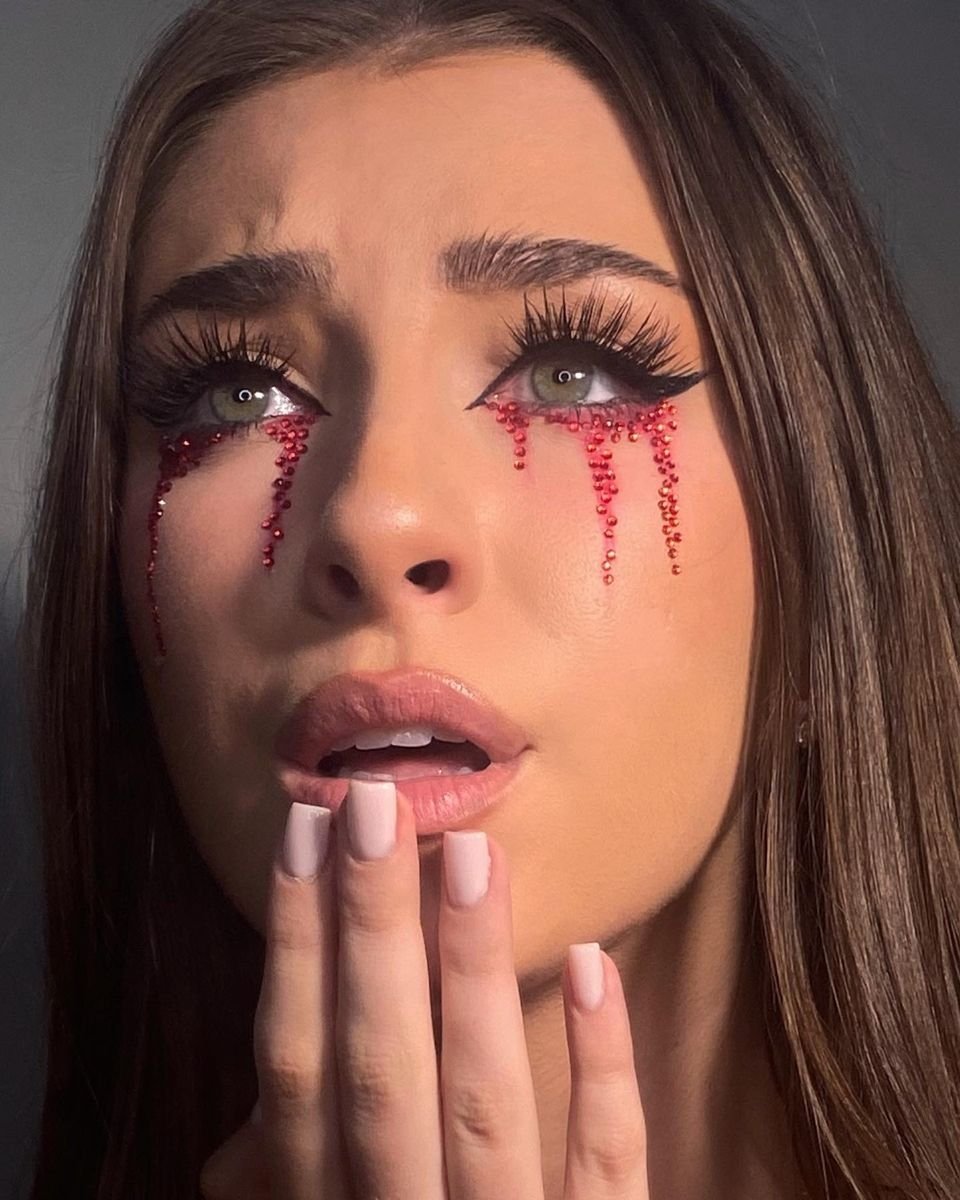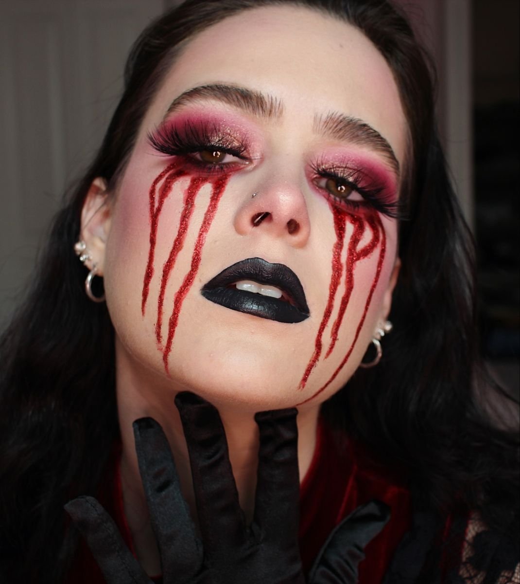 Можна піти далі й використати червоні тіні, створюючи моторошний кривавий ефект. А щоб зробити цей макіяж гламурним, можна використати блискітки чи наліпити під очі блискуче каміння, створюючи ефект сліз.