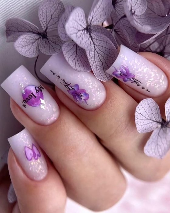 Не вийшли з тренду блискітки. Це може бути шимер, втирка, великі чи маленькі багатогранники, стрази. Їх гарно частково залити молочним гель-лаком і додати надпис. Покриваємо такий дизайн глянцевим фінішем.
