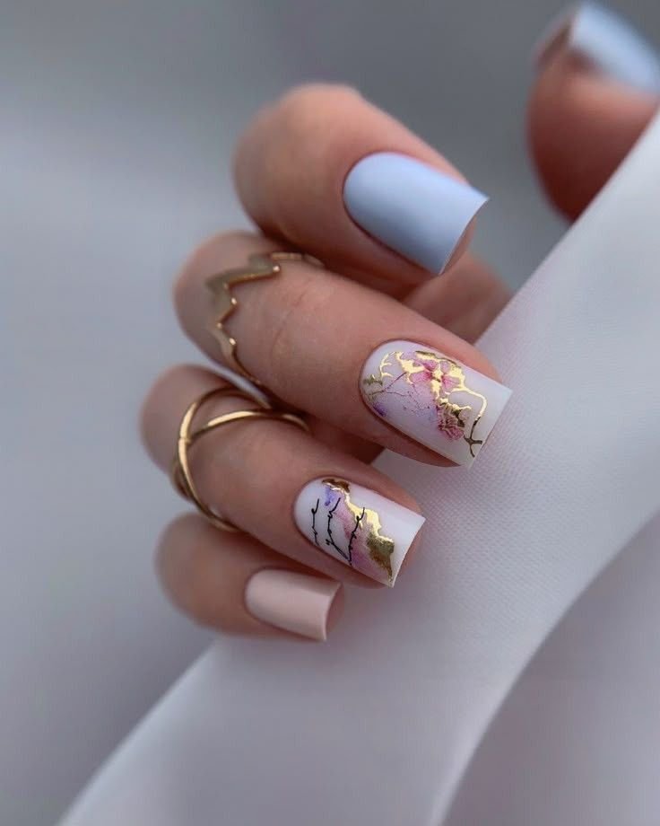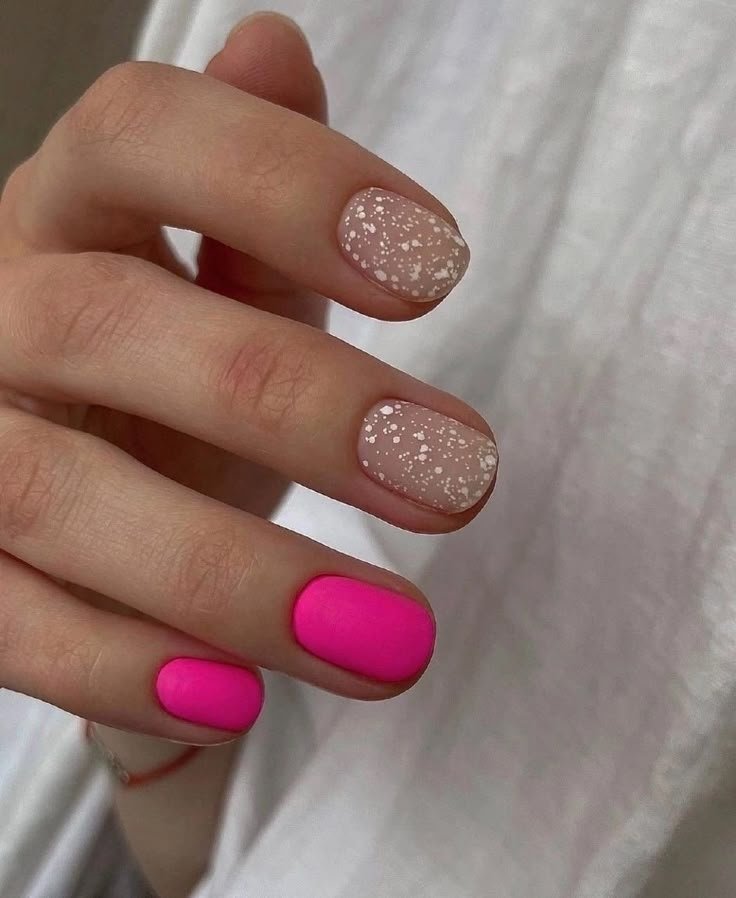 У тренді — матові нігті, контрастні кольори чи блискітки, покриті з молочною заливкою, лінії, геометричні фігури на надписи. Стильно додавати патель і стрази. Такий дизайн буде мати гарний вигляд і на коротких, і на довгих нігтях. Це ж стосується і їхньої форми.