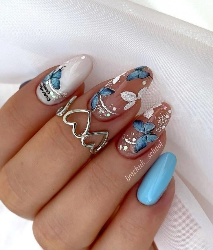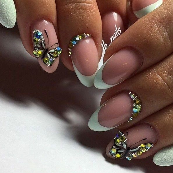 Метеликів можна малювати гель-лаками, а потім додавати блискітки, лак із ефектом котячого ока, стрази, прозорий гель чи акрилову пудру, — для об’ємного ефекту. Якщо ви не любите робити зображення власноруч, обирайте наклейки або слайдери. Доречним залишається стемпінг.