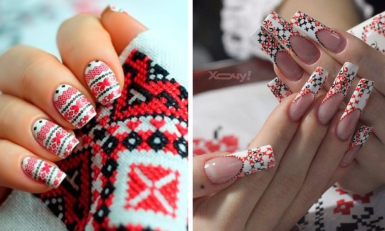У тренді — національні зображення в різній колірній гамі. Воно може бути на всіх нігтях, чи біля однотонних. Не менш актуально довершувати таким дизайном французький манікюр.