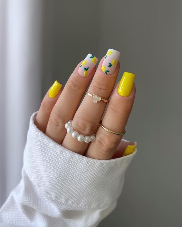 Жовтий колір нігтів цього літа доречний до будь-якого гардероба. Він актуальний, навіть якщо ви не маєте на собі й краплі цього відтінку. Декор із зображенням лимонів підкреслює свободу, креативність і сміливість.