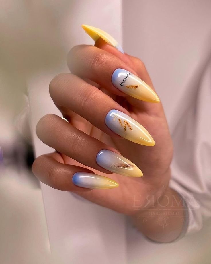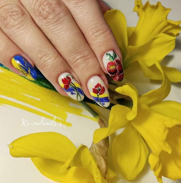 У тренді — національна символіка на нігтях. Наприклад, це можуть бути слайдери, наклейки чи малюнки калини, колосся, лелеки, тематичні надписи. Модно робити нігті різних відтінків — синіх, блакитних, або червоно-чорних.