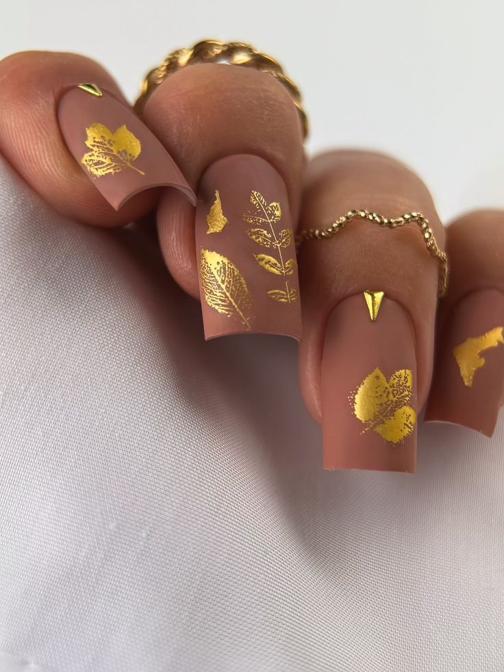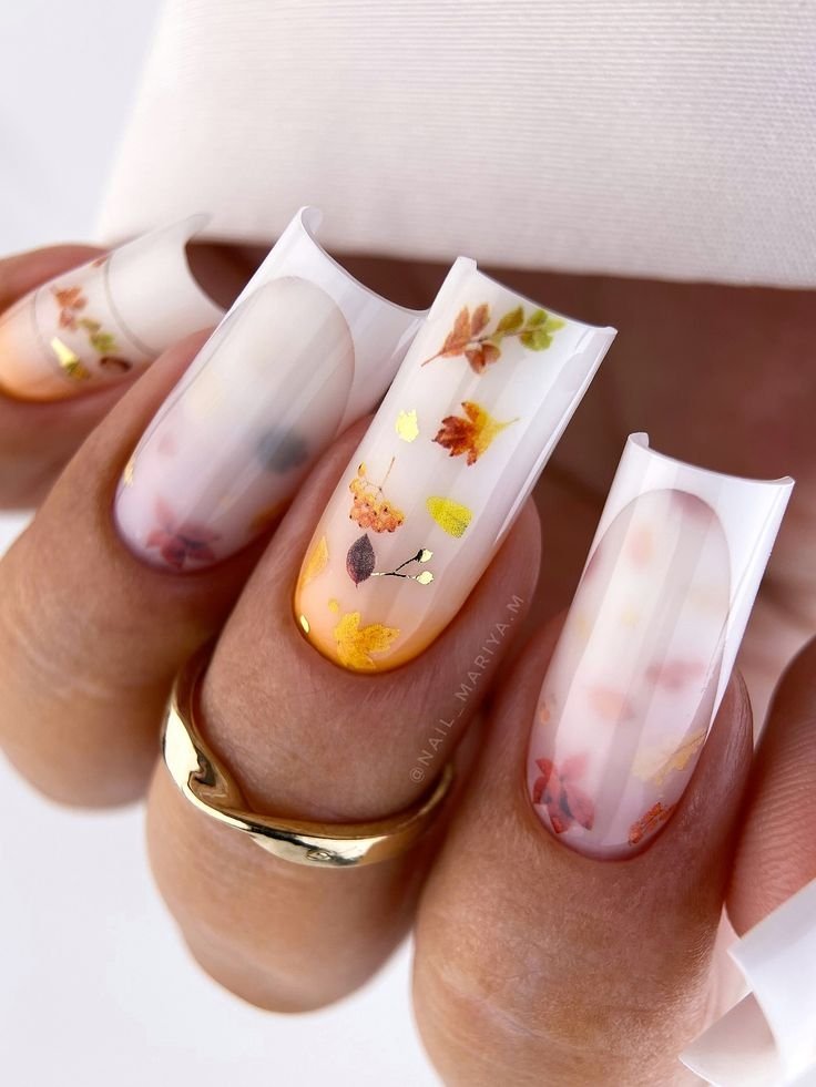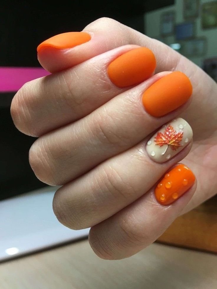 Малюнки листя можуть бути однотонними або колірними. Їх гарно покривати як матовим, так і глянцевим фінішем. А якщо ви зробите матовий нігтик, і додасте крапельки глянцю, то вийде імітація дощу.
