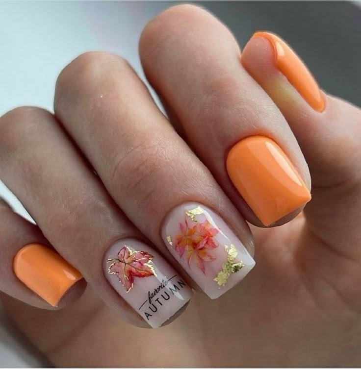 Якщо ви зробите на одній руці нігтики жовтого, помаранчевого, червоного та коричневого кольорів, а на другій — молочного, який буде декорований осіннім листям, то ваш манікюр буде одним із наймодніших. Сміливо міксуйте відтінки, малюнки, блискітки та стрази. Колірну гаму манікюру можна не підбирати під гардероб — в моді контрасти.