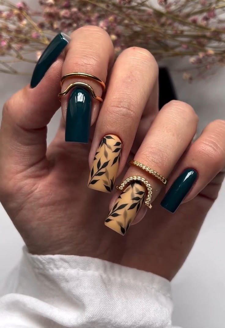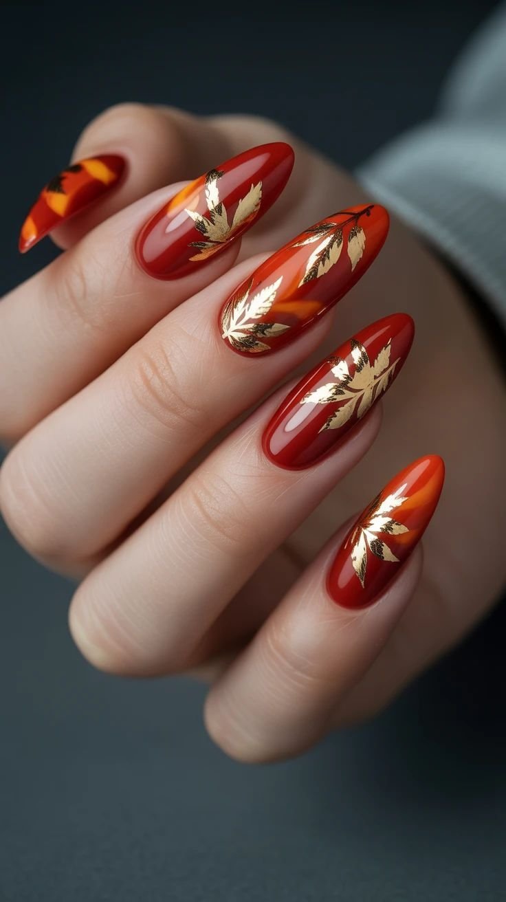 Якщо ви любите декоративні нігті, додайте до кольору осіннього дизайну. В тренді — зображення листя, гілок, ефект дощу глянцевими гелевими краплями. Виконуйте малюнки стемпінгом. Він додасть розкоші завдяки своїм чітким, тонким лініям.