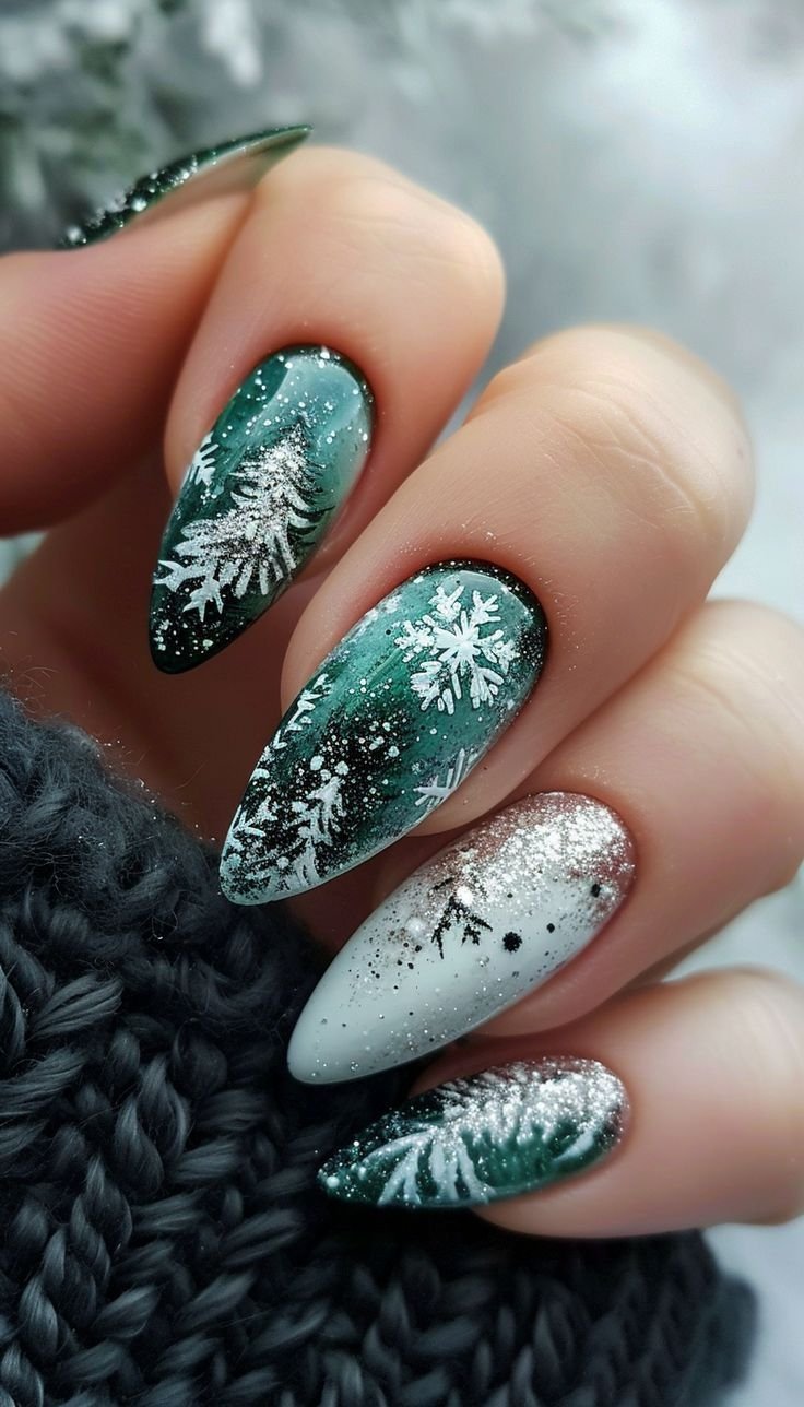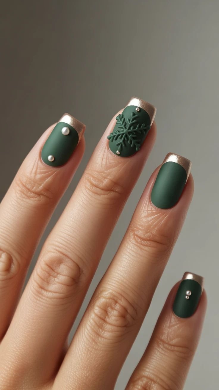 В моді — смарагдовий манікюр із розкішним дизайном. У центрі уваги опинилися об’ємні елементи, які імітують застиглі краплі льоду чи ефект в'язаного светра, виконаний акриловою пудрою. Особливого шику образу додають мініатюрні перлини та стрази, що створюють ефект ювелірних прикрас.