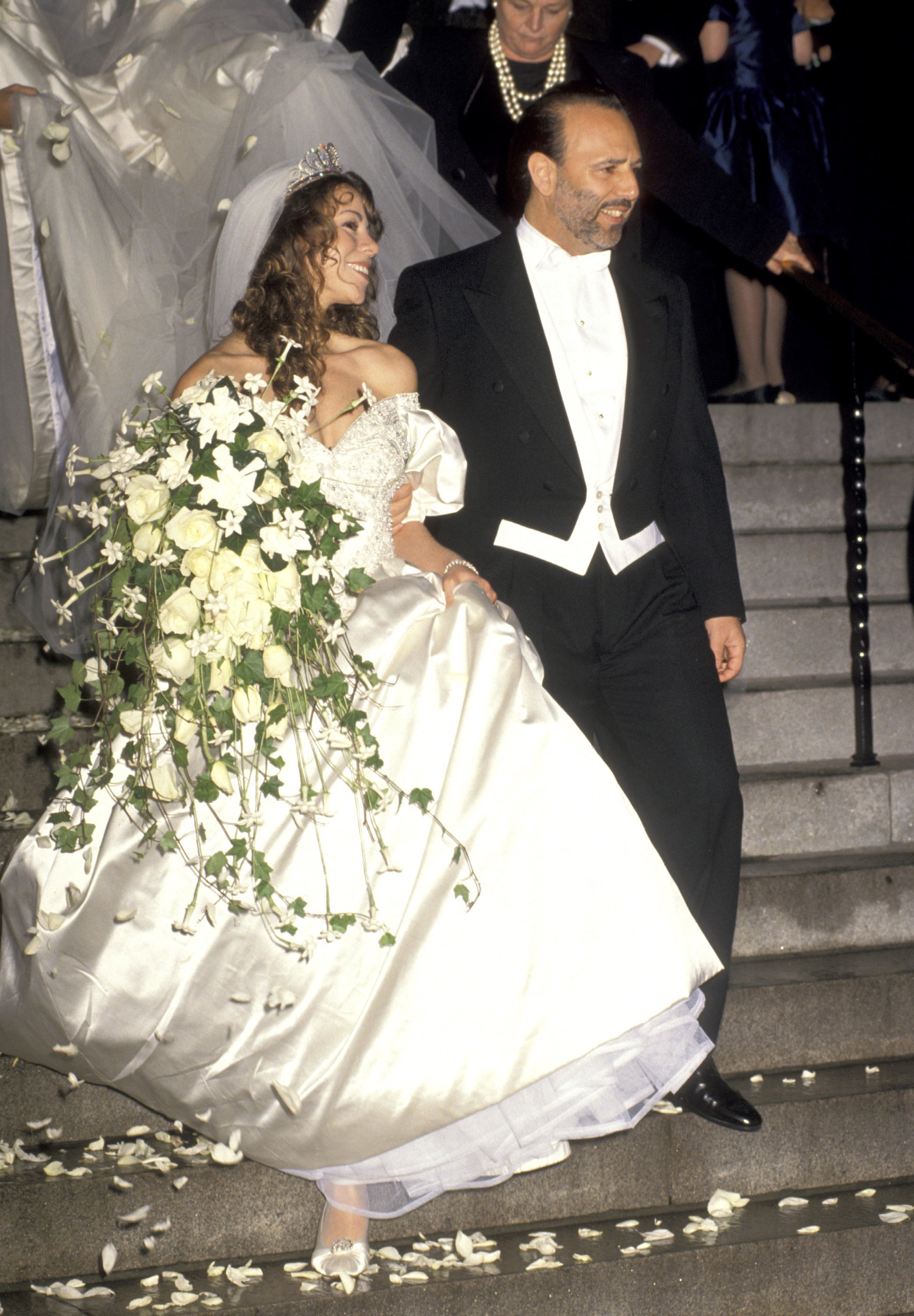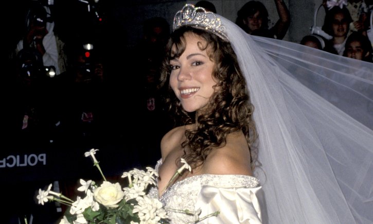 Весільна сукня Мераї Кері мала занижену лінію плеча, об’ємну спідницю, розшитий вручну бісером корсет і бант на спині. Завершував образ розкішний аксесуар — тіара, довжелезна фата і величезна зачіска. Шлейф був настільки довгим, що нести його допомагали шість асистентів. Але як і в історії з Діаною, розкішне весілля не врятувало шлюб.