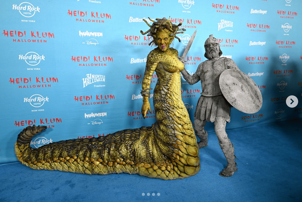 Традиційно головною зіркою свята стала Гайді Клум, яка цього разу втілила образ Медузи Горгони — з лускатою шкірою, зміями замість волосся та гострими іклами. Її чоловік Том Каулітц доповнив образ, зігравши воїна, перетвореного на камінь.