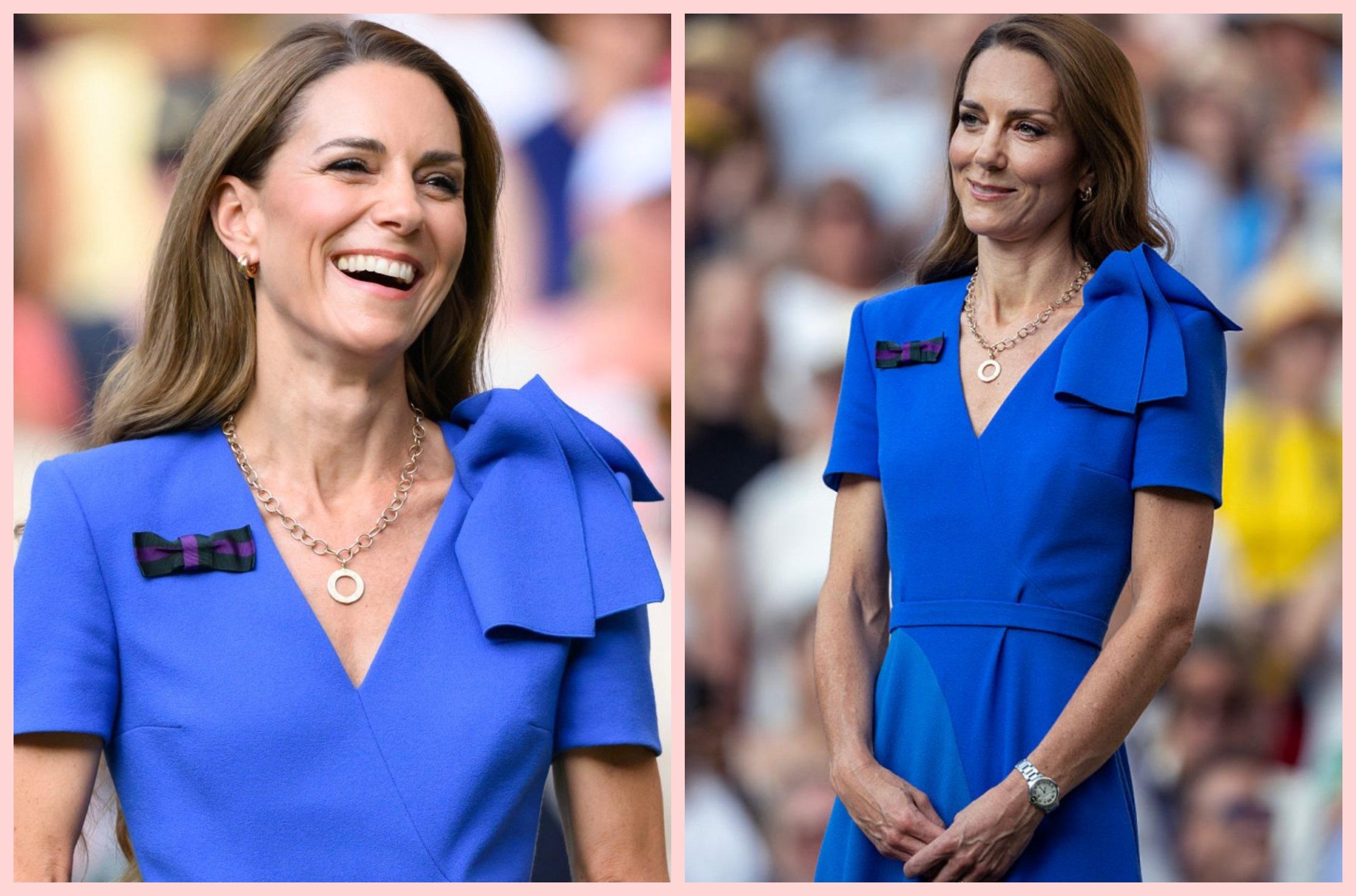 Під час фіналу чоловічого турніру Вімблдон у Лондоні принцеса Кетрін потішила публіку доволі яскравим вбранням. Кейт обрала сукню А-силуетну насиченого синього кольору від бренду Roksanda, яка була прикрашена невеликим бантом в тон на плечі. Особливою окрасою цього образу стала нетипова для леді Міддлтон ювелірна прикраса — масивний ланцюг на шиї з білого золота та діамантів.
