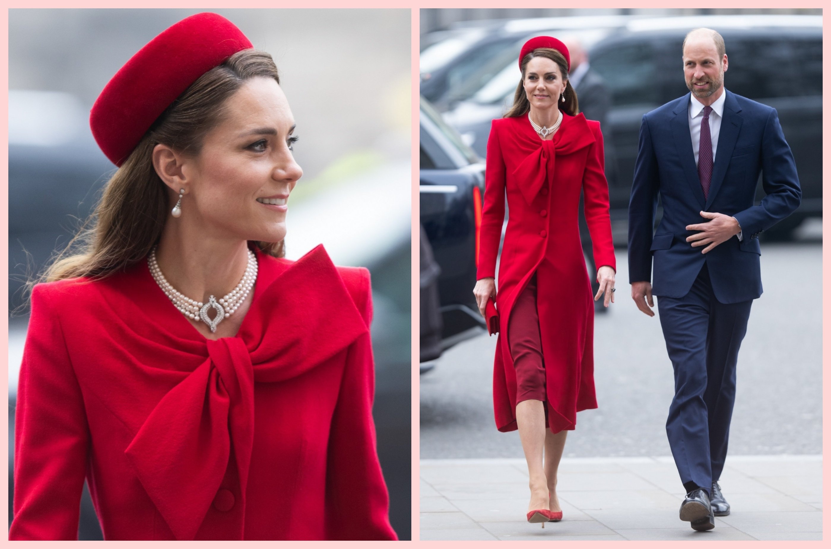 Ще один весняний образ Кейт Міддлтон, який спричинив справжній фурор. У День Співдружності принцеса вразила ефектним вбранням в червоному кольорі, яке складалося з сукні-пальта з бантом на комірі від Catherine Walker, капелюшка, клатча та взуття в тон. А особливо вишуканими акцентами тут виступили перлинні прикраси — кольє та сережки.