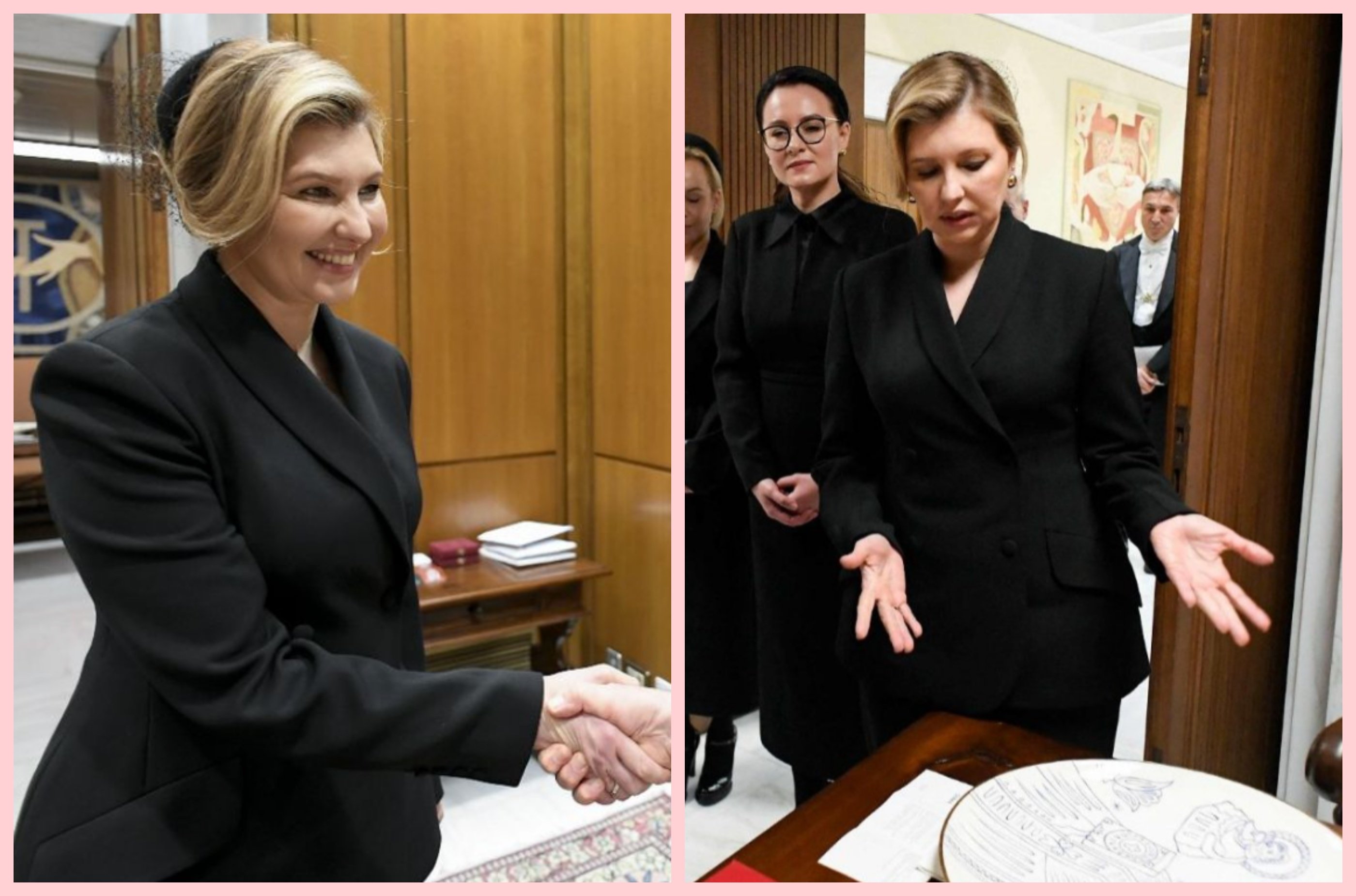 Для зустрічі з Папою Римським Олена Зеленська обрала стримане, але жіночне вбрання. Перша леді одягнула чорний костюм з приталеним піджаком та ефектний капелюшок з вуаллю в тон.