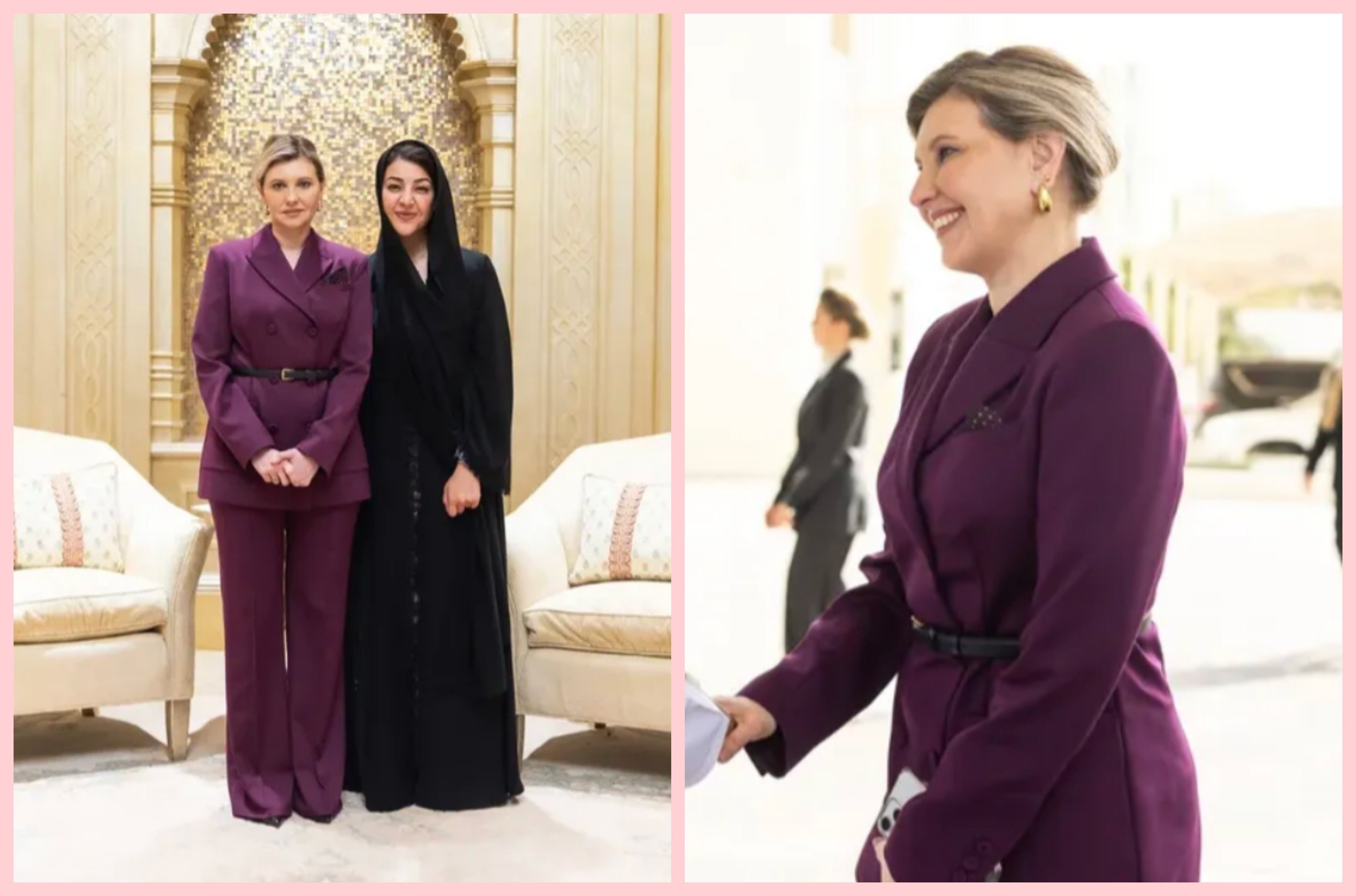 Під час робочого візиту до ОАЕ Зеленська здивувала яскравим вбранням. Перша леді України обрала костюм баклажанового кольору з широкими штанами та подовженим двобортним жакетом. Доповнила образ Олена чорним ременем, зробивши акцент на талії.