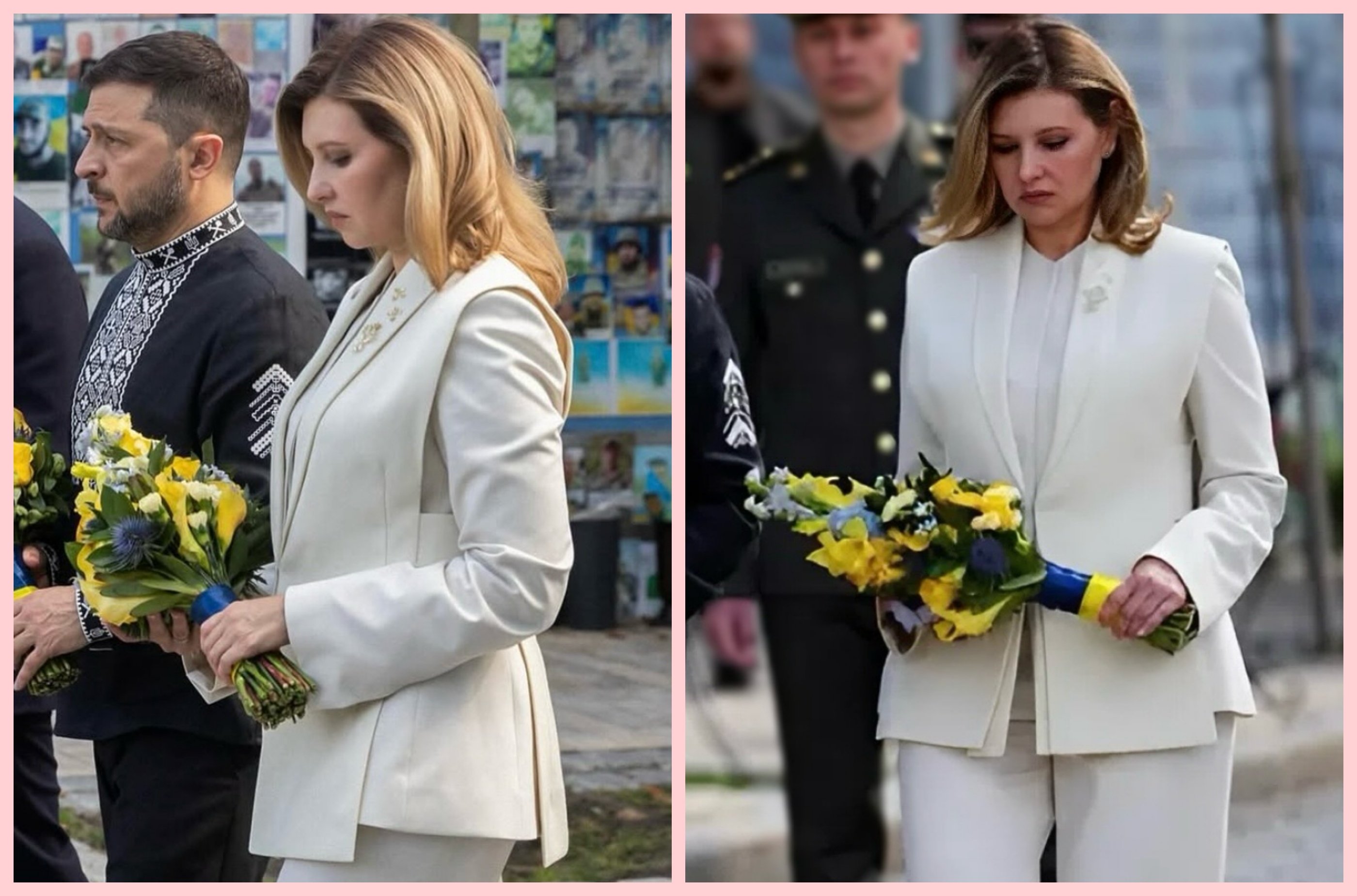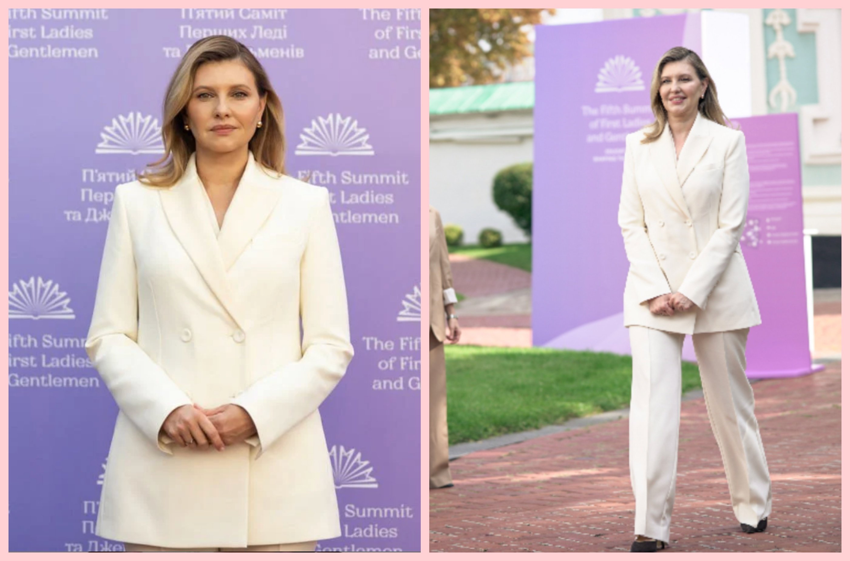 Одним з найелегантніших виходів Олен Зеленської став її образ на п'ятому Саміті перших леді та джентльменів в Києві. На події дружина президента позувала в молочному костюмі від GASANOVA.
